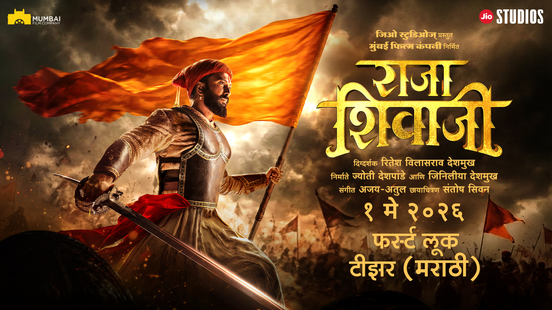 ‘जिओ स्टुडिओज’द्वारे सादर करण्यात आलेला आणि मुंबई फिल्म कंपनीच्या बॅनरखाली ज्योती देशपांडे व जिनिलिया रितेश देशमुख यांनी निर्मित केलेला ‘राजा शिवाजी’ हा चित्रपट १ मे २०२६ रोजी जगभरातील चित्रपटगृहांमध्ये मराठी, हिंदी आणि तेलुगू भाषांमध्ये प्रदर्शित होणार आहे. या चित्रपटाच्या माध्यमातून भारतीय इतिहासाचा एक गौरवशाली अध्याय नव्या पिढीसमोर भव्य, भावनिक आणि प्रेरणादायी स्वरूपात उलगडला जाणार आहे. ‘राजा शिवाजी’ हा केवळ चित्रपट नसून एक भव्य सिनेउत्सव ठरणार असून, इतिहास आणि मनोरंजन यांचा संगम अनुभवण्याची एक सुवर्णसंधी प्रेक्षकांना देणार आहे.